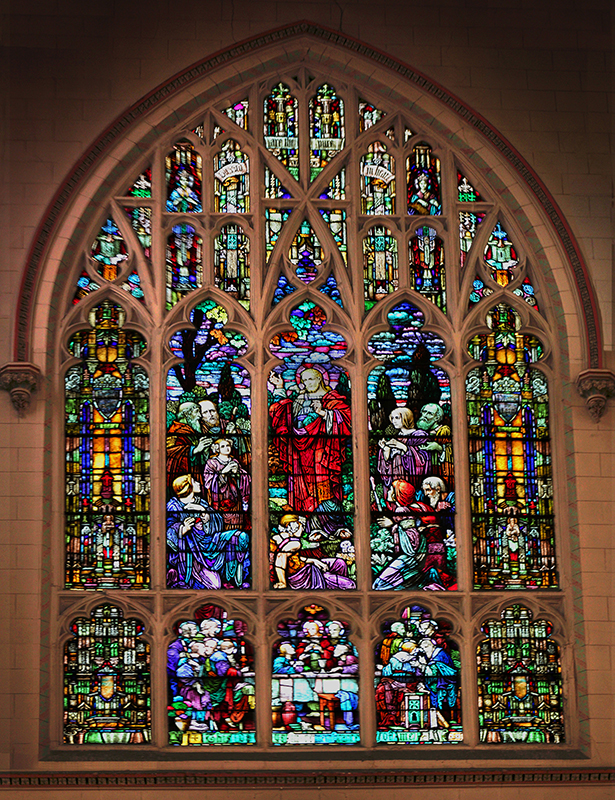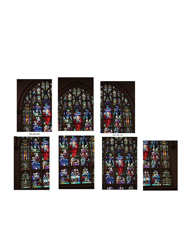 I was presented with a series of low light photos by a fledgling photographer who was unable to capture the entire window in a single frame from his position. What's more, the inability to use a flash during services made it impossible to capture the detail of the surrounding architecture. Luckily for me, he shot in RAW format, and I was able to enhance detail and composite the images and reconstruct them into a single image.